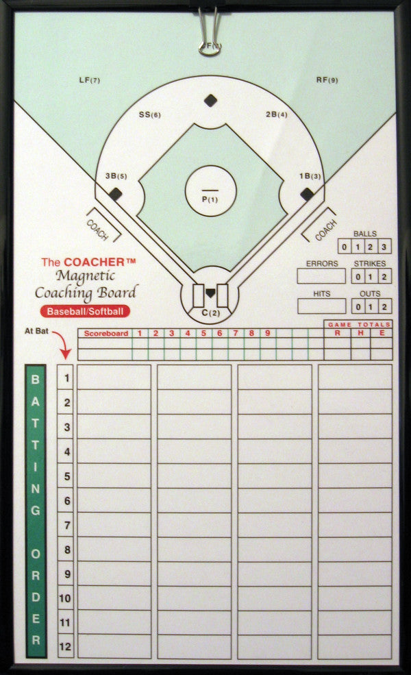 C-7000 Baseball Softball Hybrid Board is 9 inch x 14 inch and comes with 30 magnetic C-channel tabs, a dry erase pen and a two color card stock.