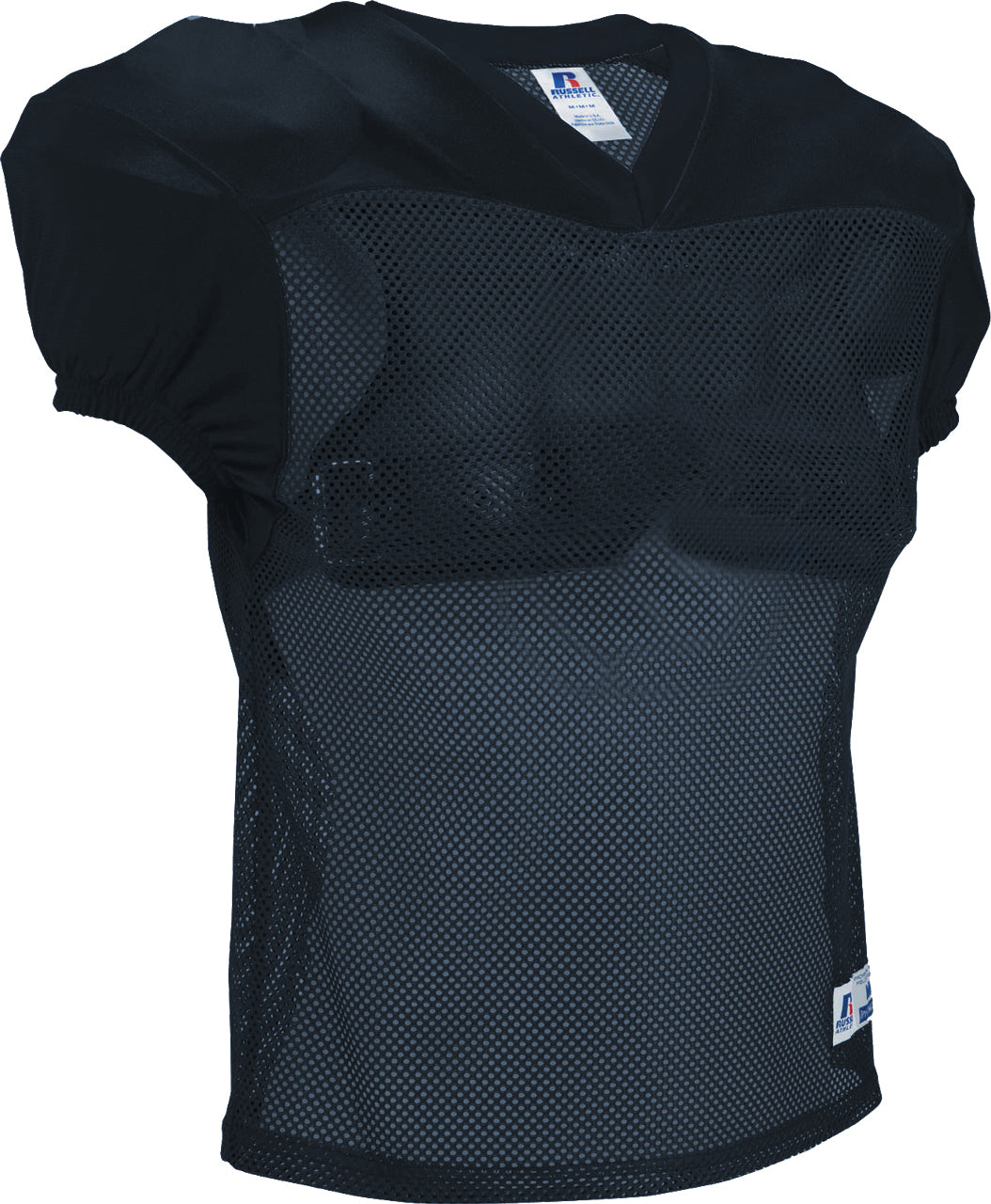 The Russell Athletic youth stock practice jersey is constructed as a belt length jersey with two ply high luster yoke and seven-inch hemmed sleeves with elastic. Features: Belt length jersey. Two ply high luster yoke. 7" Hemmed sleeves with elastic. 1" Modified rib knit V-neck. 6B Cloth: Colors - 100% Nylon; White - 100% Polyester.